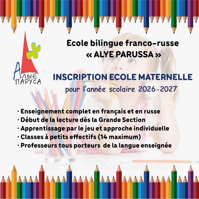 Choisir de scolariser votre enfant à l’école bilingue « Alye Parussa », c’est lui offrir des conditions éducatives exceptionnelles dès le plus jeune âge. En effet, l’enseignement en double programme français et russe en parallèle permet de développer la flexibilité de l’enfant et fait de lui un enfant bilingue porteur d’une double culture, créatif et curieux d’apprendre. Nous enseignons un double programme : les programmes de l’éducation nationale française et russe en parallèle. Et cela dans toutes les matières : écriture, lecture, anglais, mathématiques, découverte du monde, histoire, disciplines artistiques. Après la classe de CM2 nos élèves intègrent les meilleurs collèges de Paris. 21 et 27 décembre, 11 janvier l’école « Alye Parussa » et les acteurs du Théâtre des jeunes spectateurs « Konfetti » vous invitent, vous et vos enfants, à un joyeux spectacle musical « Le Navire volant, ou Un cadeau pour le Nouvel An ».